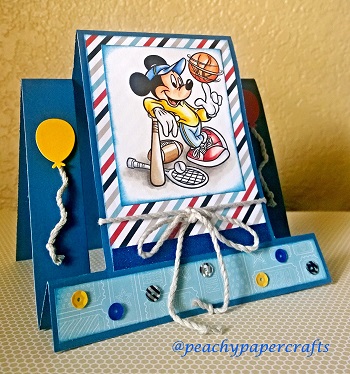 The summer Olympics is just around the corner, so design team sister Sarah challenges us to make a sport-themed project. I could not decide on just any sport, so I included a whole bunch of them when I made a center step card. I had seen design team sister Glenda make some, and I always told myself to try it, one of these days. Using Copics, I colored a free image of Mickey from the internet and paired it with paper and embellishments from Close To My Heart's Magical collection-- the paper pack, Complements, and sequin pack. I added some Whisper twine and Blue Shimmer Trim to complete the look.